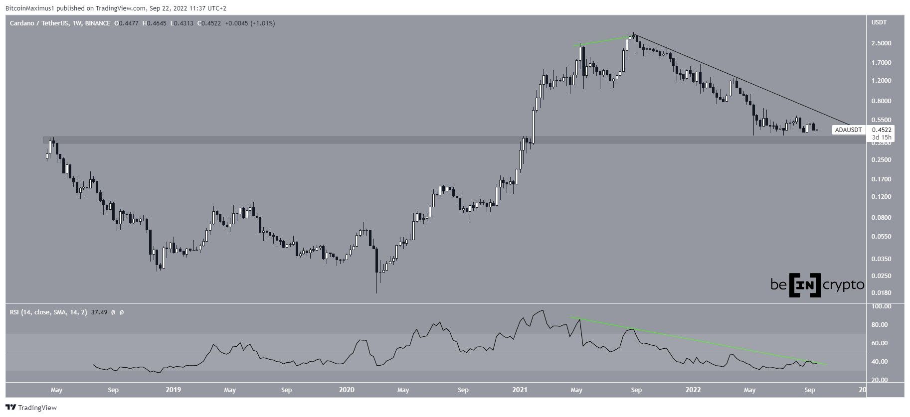 ADA has been decreasing below a descending resistance line since Sept. 2021, when it had just reached an all-time high price of $3.10. The decrease has led to a low of $0.40 in May 2022.