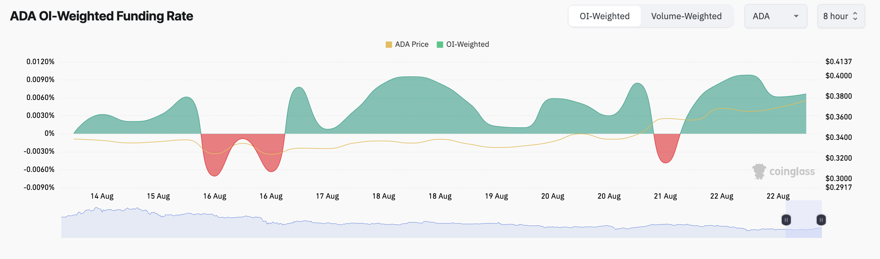 The predominantly positive funding rates for ADA over the past seven days show that most of these traders are favoring long positions. Currently, the funding rate sits at 0.0067%, suggesting that more traders expect ADA’s price to rise rather than fall.