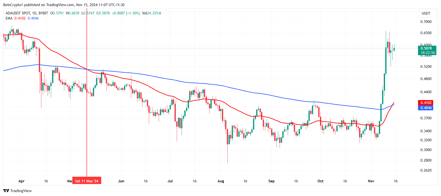 Cardano is currently experiencing a macro-level shift, with its EMAs forming a Golden Cross—a bullish indicator. The 50-day EMA crossing above the 200-day EMA marks the end of a six-month Death Cross. This Golden Cross is Cardano’s first in 12 months and signals a potential long-term uptrend for the cryptocurrency.