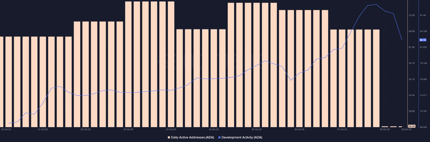Compiling both these datasets, Cardano’s development activity grew tremendously over the past week. Meanwhile, the number of daily active addresses increased steadily, at present it stands at around 67,000.