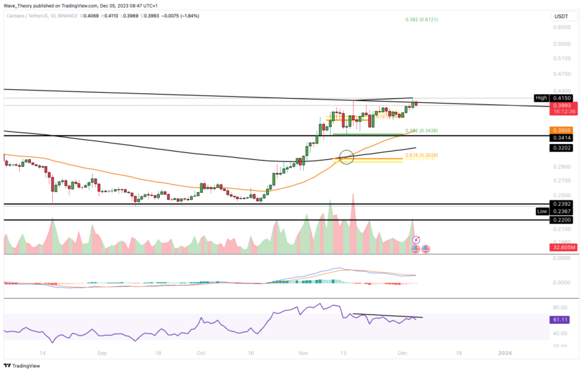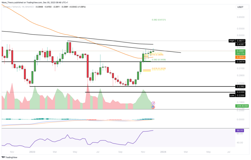 Adding to this resistance, just above the current level at around $0.43, there lies another substantial barrier. At the 50-month Exponential Moving Average (EMA). Overcoming this resistance zone, particularly between the $0.4 and $0.43 levels, could open the path for Cardano. It aims for the .382 Fibonacci resistance level, approximately at $0.61