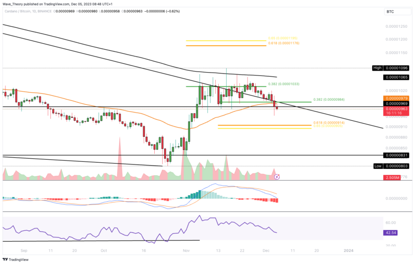 In its trading against Bitcoin (BTC), Cardano has not secured a close above the 0.382 Fibonacci (Fib) resistance level. This is located at approximately 0.00001034 BTC. Furthermore, Cardano has recently broken through the 0.382 Fib support level at around 0.00000984 BTC in a bearish manner.