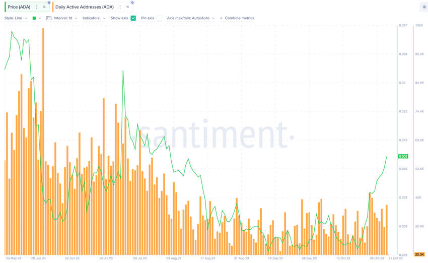 According to Santiment, Cardano has attracted a consistently high level of network activity over the past week. The chart below illustrates that Cardano has witnessed a steady flow of network activity from at least 30,000 unique addresses in each of the last 9 days dating back to October 23.