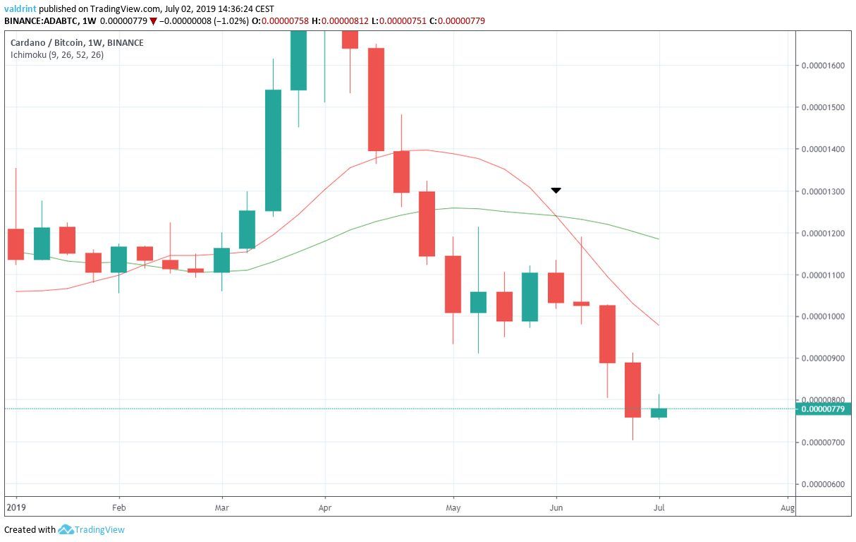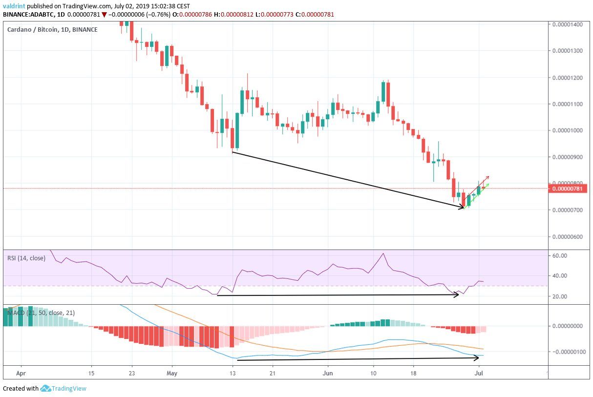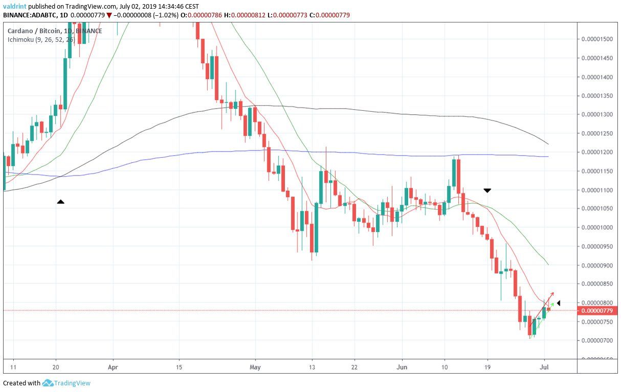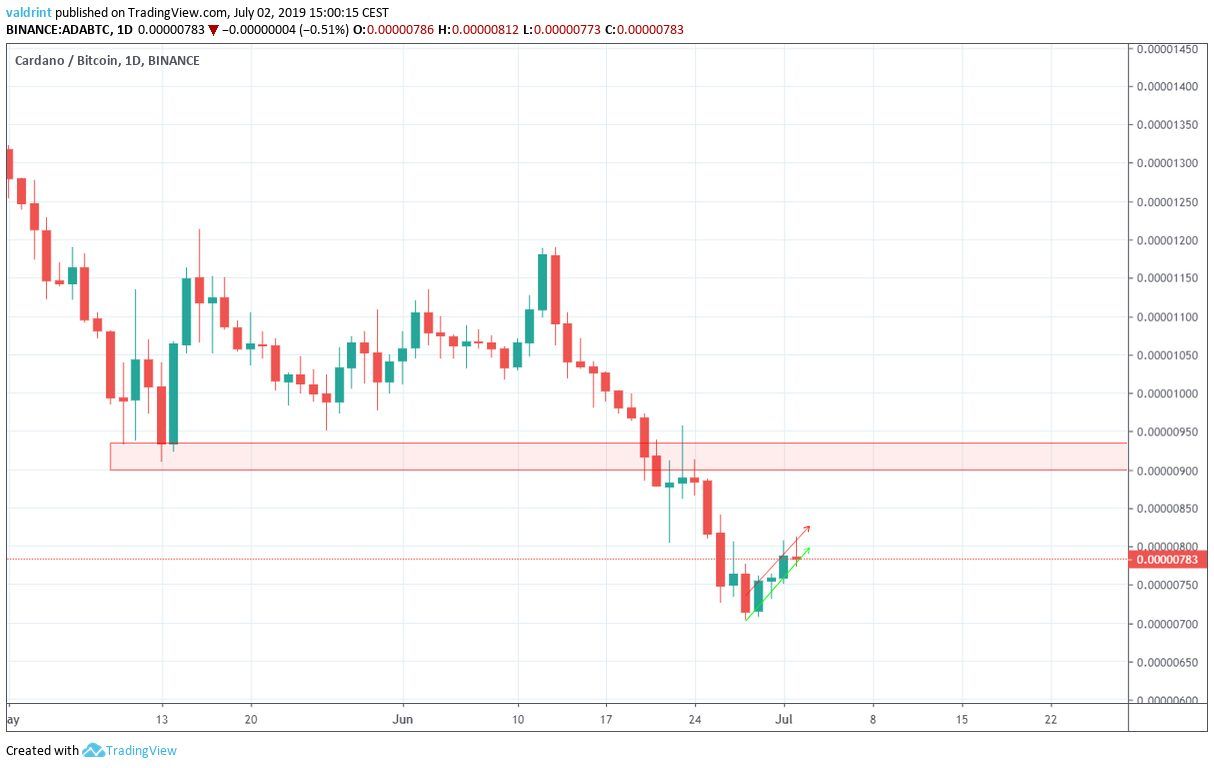 At the time of writing, the Cardano price was trading near 800 satoshis, close to the lows reached prior to the upward move in Dec 2017.