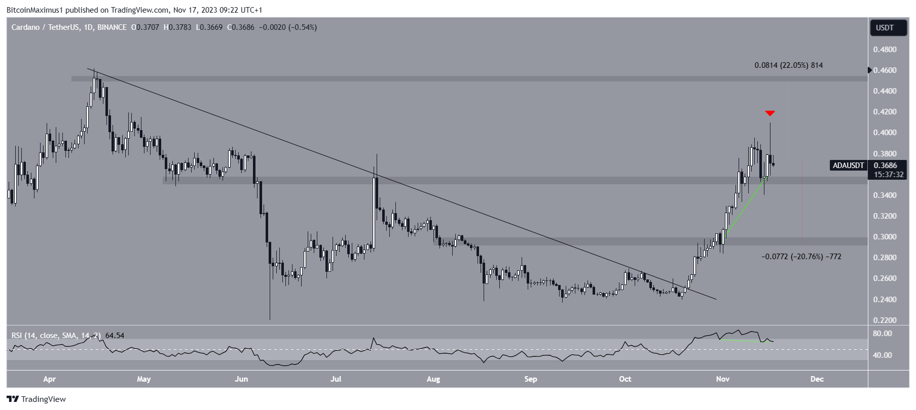 The ADA price fell slightly afterward but still trades above the $0.35 support area. Will it begin another increase?