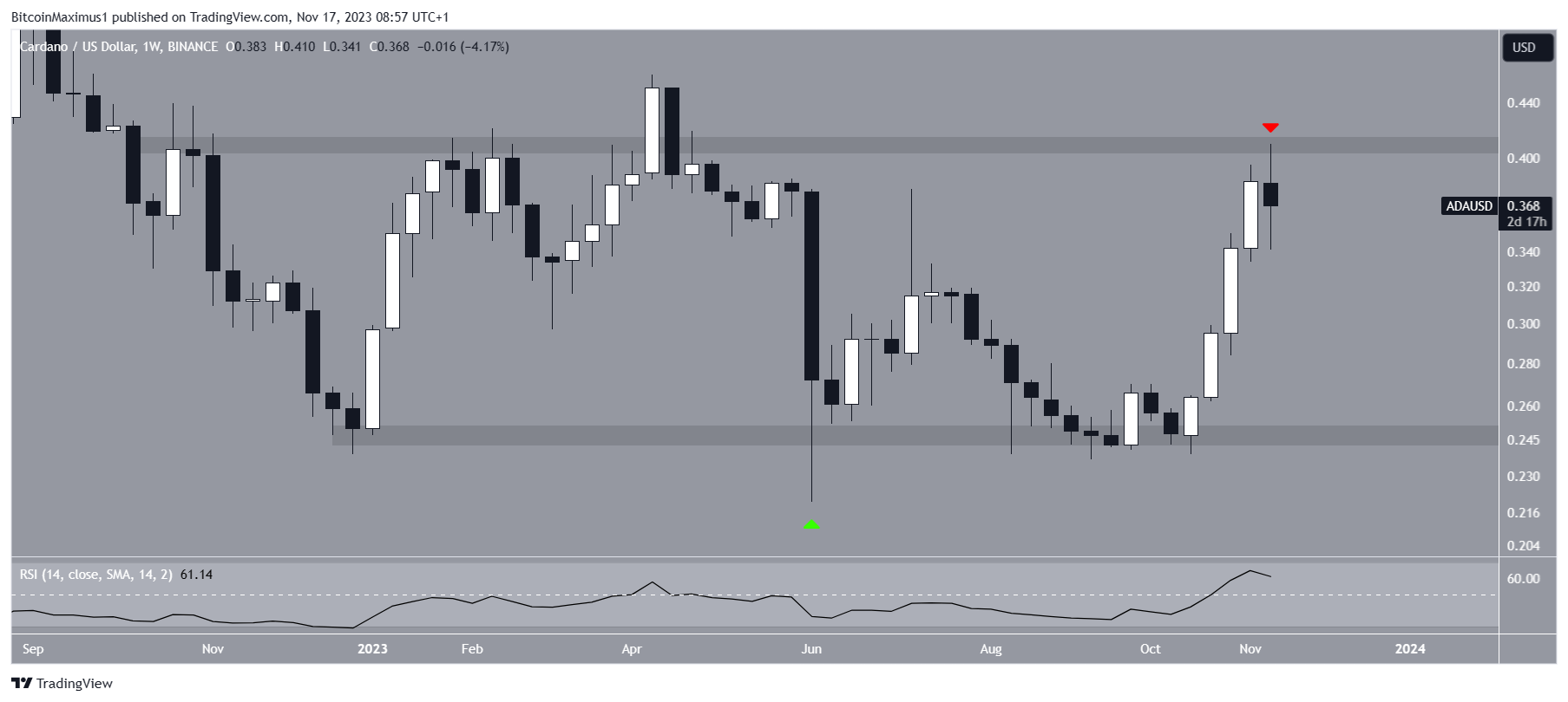 The ADA weekly timeframe technical analysis shows that ADA has traded between $0.25 and $0.40 since November 2022.