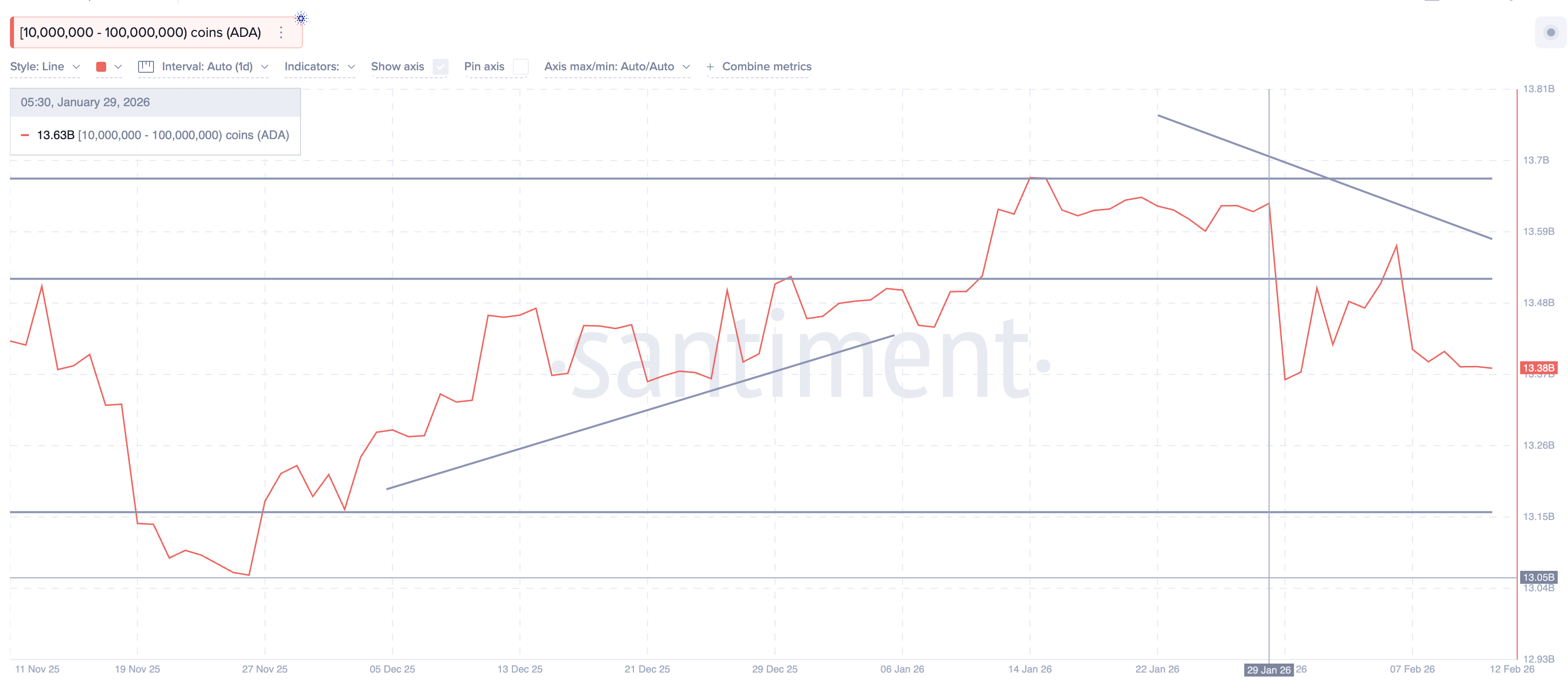 This time, the opposite is happening. Since mid-January, these same whales have been reducing exposure. On January 14, they held around 13.67 billion ADA. That figure has now dropped closer to 13.3 billion. The overall trend has shifted from accumulation to distribution.