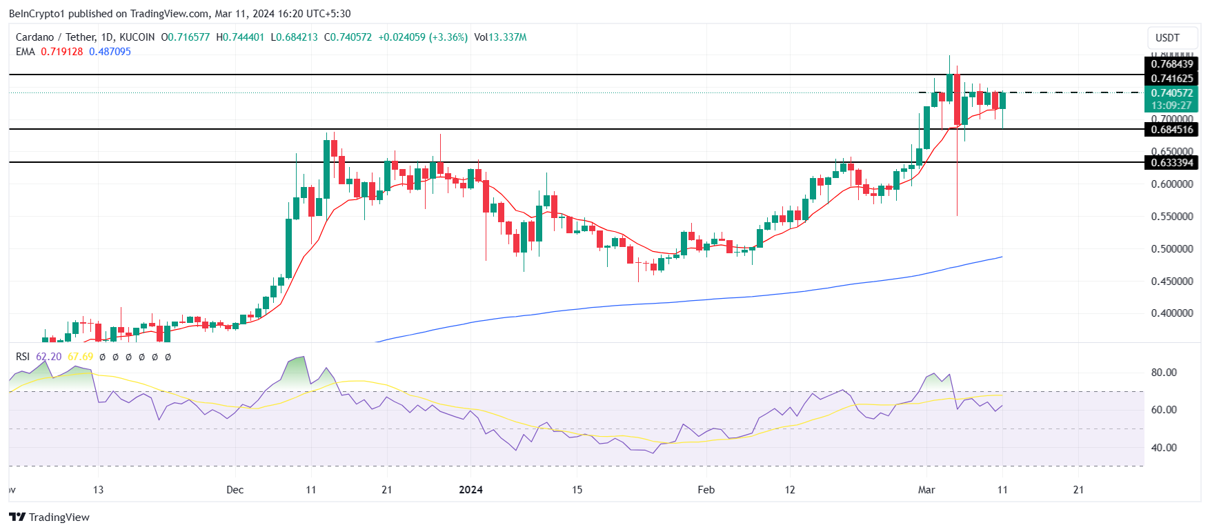 Cardano is noting a slowdown in its rally after charting a rally near 60% since the end of January this year. The third-generation cryptocurrency is struggling to breach a crucial resistance level of $0.76 after failing to break through it once.
