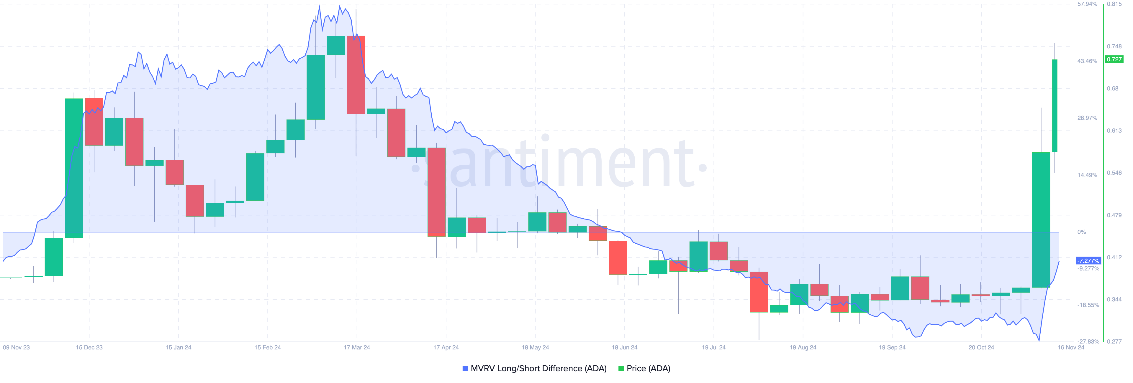 For ADA, the 30-day MVRV ratio is -7.27%, indicating that if all Cardano holders sell, the average return on investment could be a loss. Historically, when the ratio is at this level, it means that ADA’s price could continue to climb.