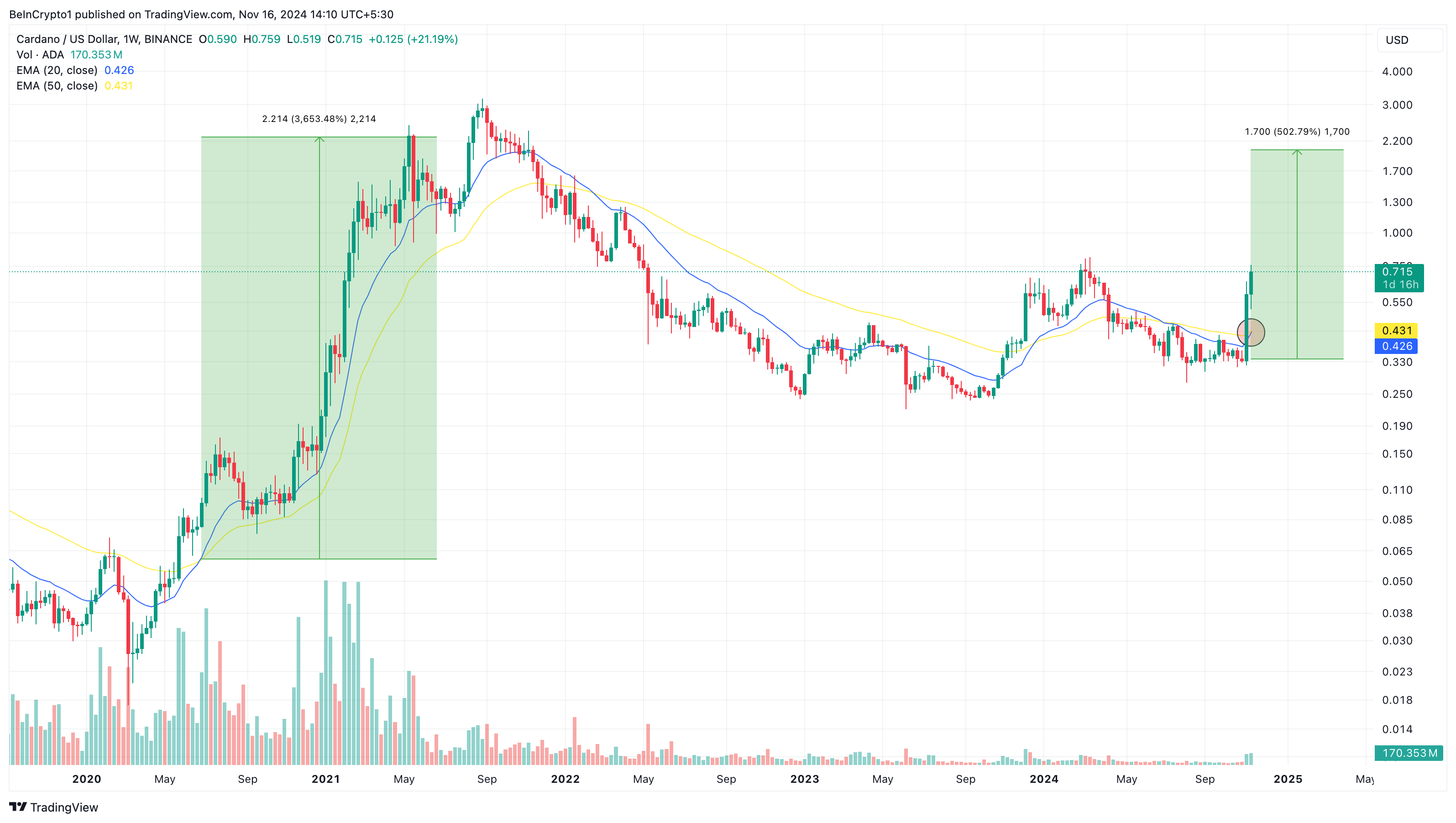 During that period, ADA climbed from $0.061 to $2.29. Currently, the 20 EMA (blue) has just crossed above the 50 EMA (yellow), signaling renewed bullish momentum for the token. While a similar percentage rally may be unlikely, ADA could still see a substantial gain of up to 500% over the coming months if past performances influence future trends.