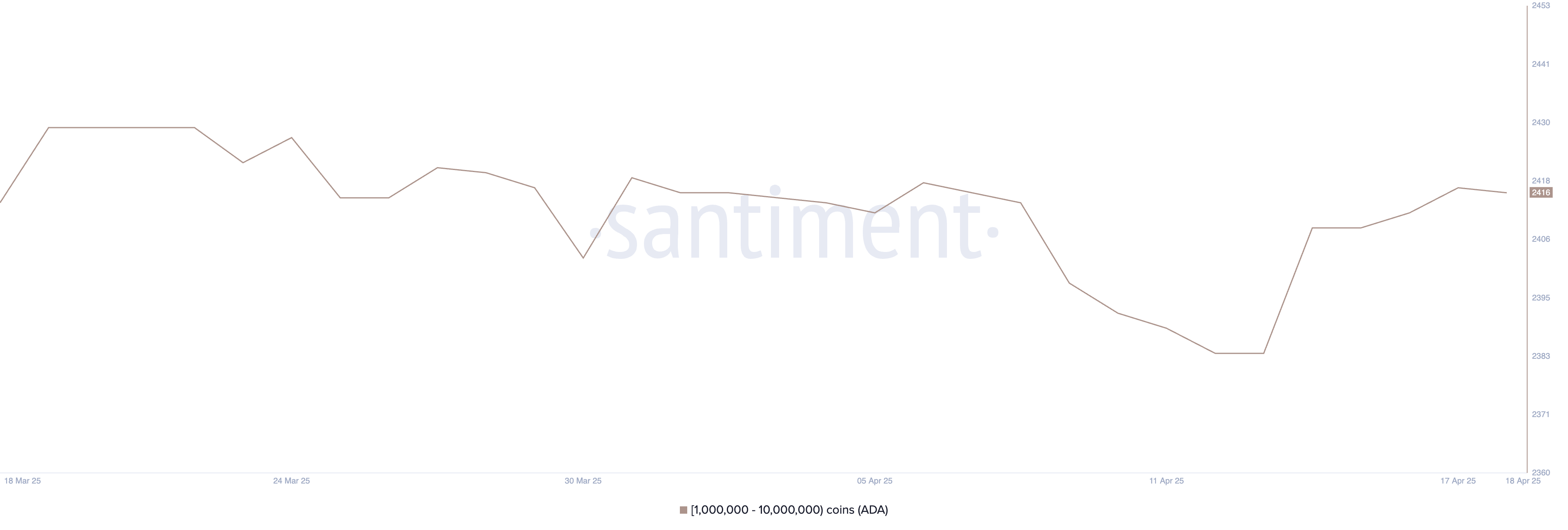 The number of Cardano whale addresses—wallets holding between 1 million and 10 million ADA—saw a sharp increase between April 13 and April 17, jumping from 2,384 to 2,417, marking the highest level since early April.