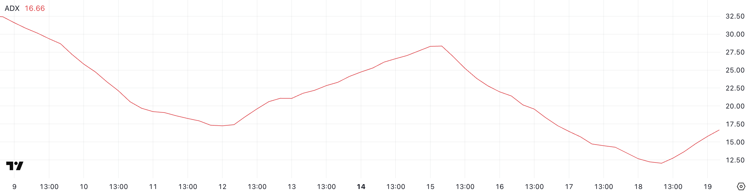 Cardano’s ADX (Average Directional Index) is currently at 16.66, rebounding slightly after falling from 28.35 four days ago to a low of 12 just a day ago.