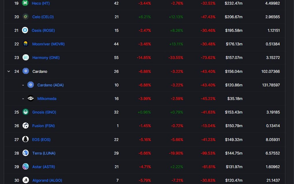 Losing more than 65% of its value locked, Cardano has lost its place in line to Oasis, Harmony, Moonriver, Celo, Bitcoin, Osmosis, Elrond, and Heco.