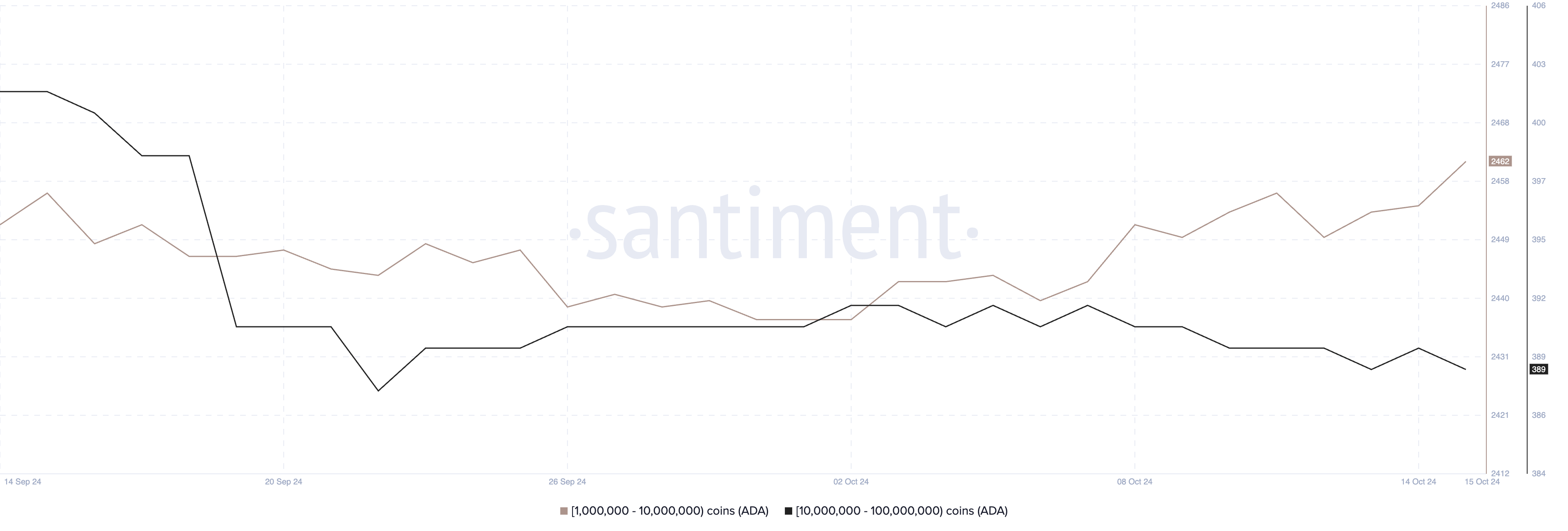 However, from October 12 to October 15, the number of addresses holding between 1 million and 10 million ADA grew from 2,450 to 2,462, suggesting renewed interest from smaller whales while the larger whale cohort remains steady. These subtle shifts in holdings can provide valuable insights into potential market trends.