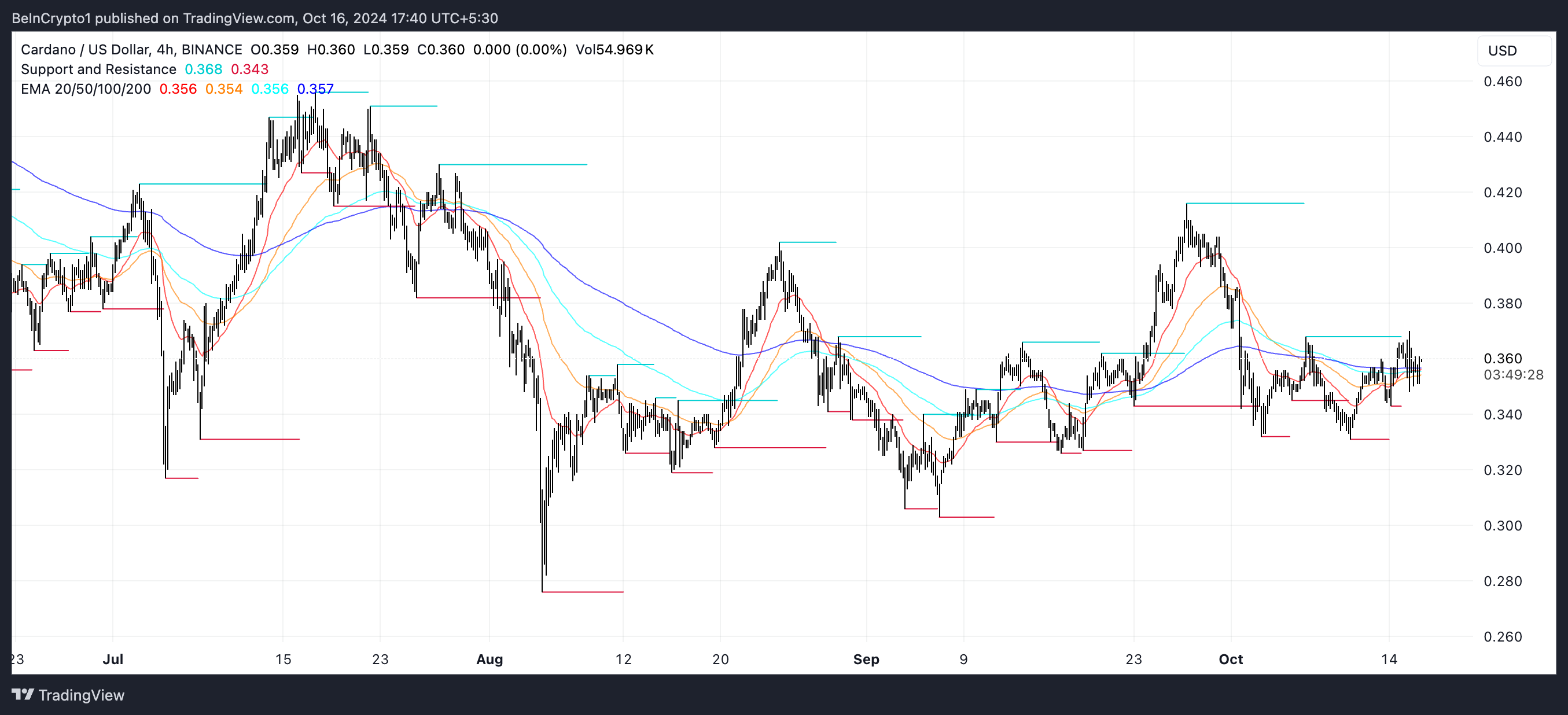 However, if a downtrend takes hold instead, ADA’s price could fall to support levels around $0.328 or even $0.303, suggesting a risk of further price depreciation if selling pressure intensifies.