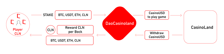 To participate in gambling, players need to convert cAssets to CasinoUSD with 1:1 ratio to USD. These assets won’t be locked and are available for withdrawal anytime. When players use the DaoCasinoLand platform, they are not only able to make profits by winning the bet, but also receive extra CLN. At CasinoLand we understand the concerns of our investors, thus to maintain the value of CLN token, we are introducing two major features into the Ecosystem: Staking and Banker.