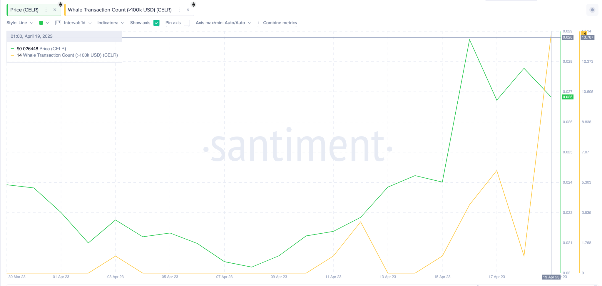 Similarly, CELR appears to be again drawing the attention of large institutional investors. After recording only 1 transaction worth at least $100,000 in the first 10 days of April, CELR whale transactions picked up in the past week