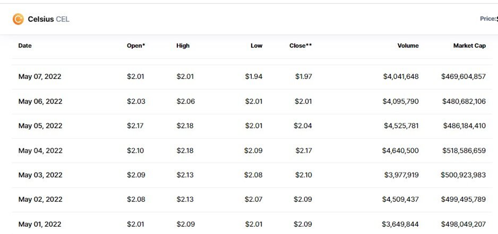 In May, trading volume reached a peak of $14.84 million on May 12. On that day, CEL opened at $1.03, reached an intraday low of $0.507, closed at $0.9907, and corresponded to a market capitalization of approximately $236.64 million.