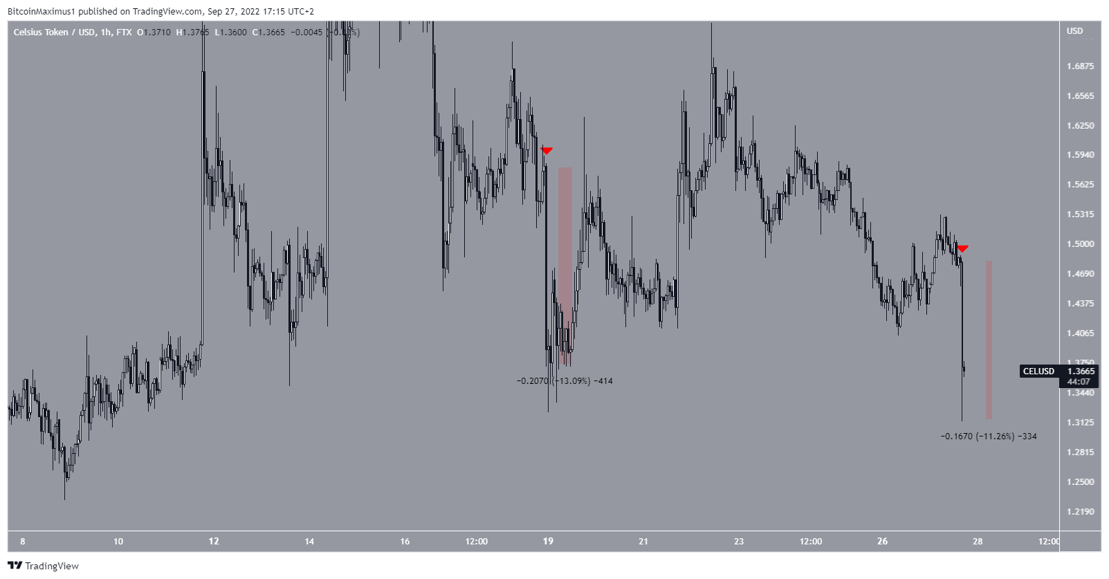 Shortly after the announcement, the price decreased by 11%, leading to a low of 1.31. This was the lowest price since Sept. 9 and the sharpest hourly decrease since Sept. 18 (red icons)