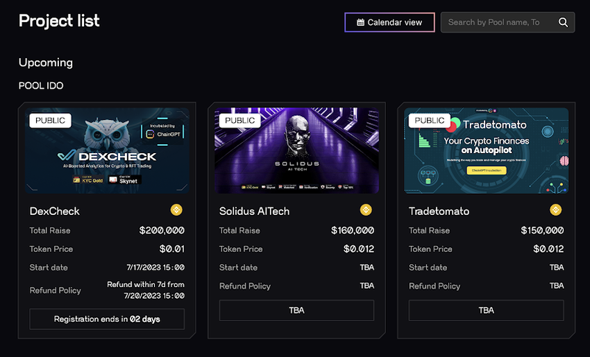 SponsoredImmediately upon launch, ChainGPT orchestrated a world-class lineup of three startups that have been going through the incubation program and have prepared to launch their IDOs in the months of July-August. With three projects already establishing their technical aptitude and social presence, here is who will be launching through the ChainGPT pad: DexCheck, TradeTomato, and Solidus AI Tech.