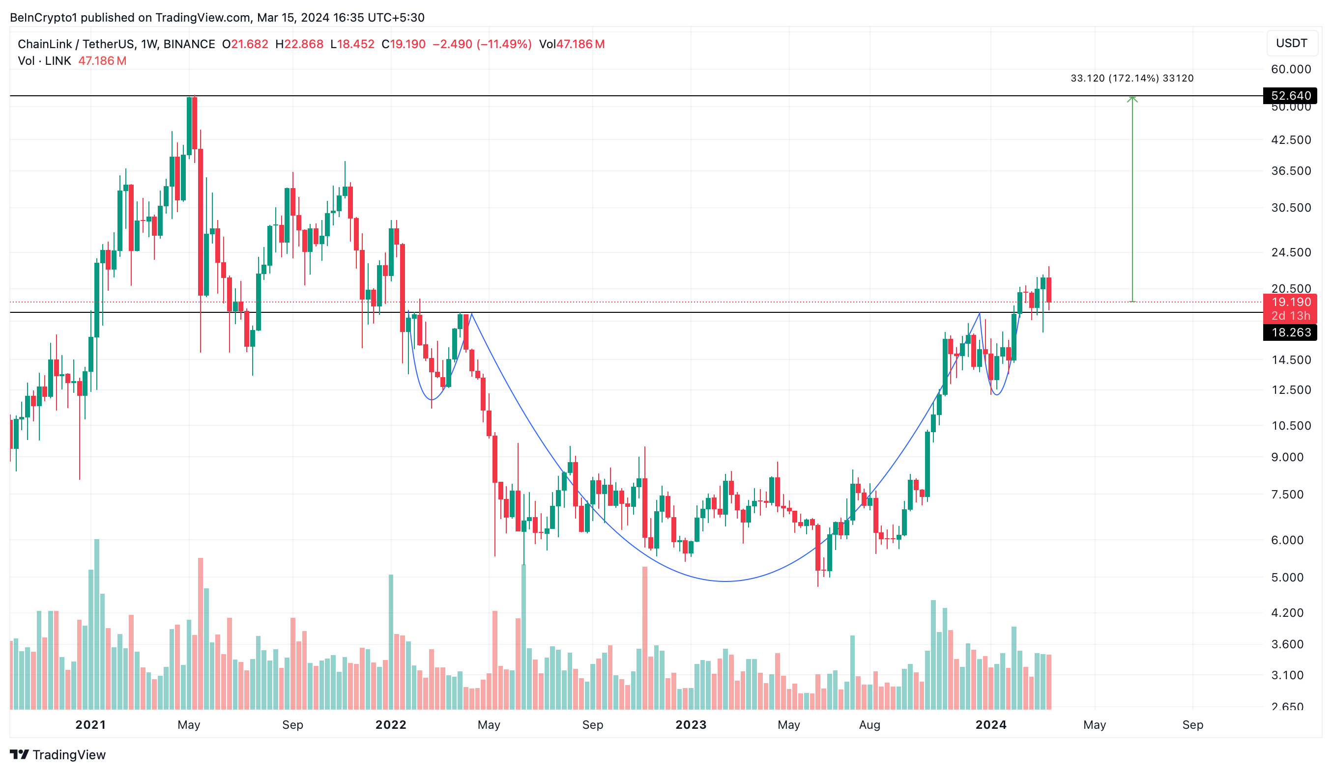 The price dynamics of Chainlink mirror its strong market presence, peaking at $22.86 on March 11, a two-year high. Currently, LINK tests the $18.26 support level, derived from an inverse head and shoulder pattern on the weekly chart. If it holds above this support, a gradual rise to its May 2021 high of $53 is plausible.