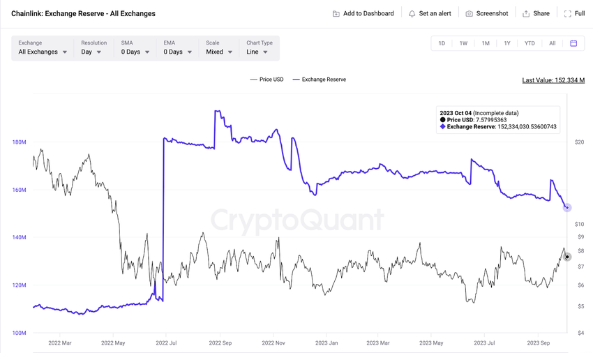 The CryptoQuant chart below illustrates that LINK Exchange Reserves dropped to 152 million tokens on October 3. Notably, this is the lowest since Chainlink introduced its native staking roadmap in June 2022.