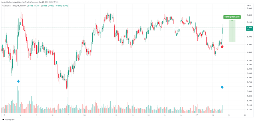 The LINK token price rose nearly 9% in response to the listing from $6.65 to $7.25 (red arrow). Moreover, LINK generated the highest hourly trading volume since June 15 (blue arrows). It currently sits at $7.05 and continues to rise.