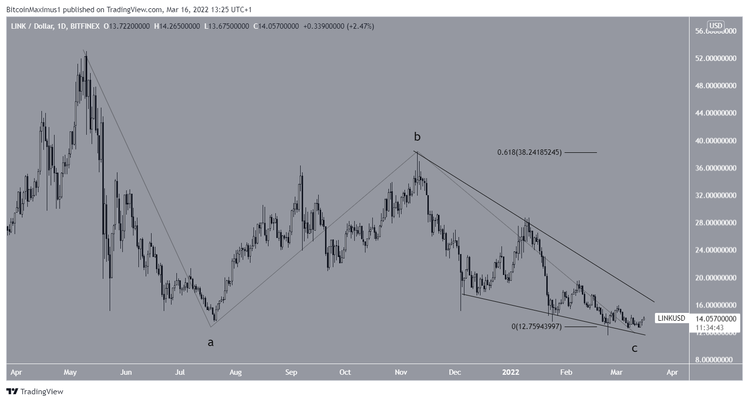 Since Nov 10, LINK has been trading inside a descending wedge. The descending wedge is considered a bullish pattern, suggesting that a breakout would be the most likely scenario.Â