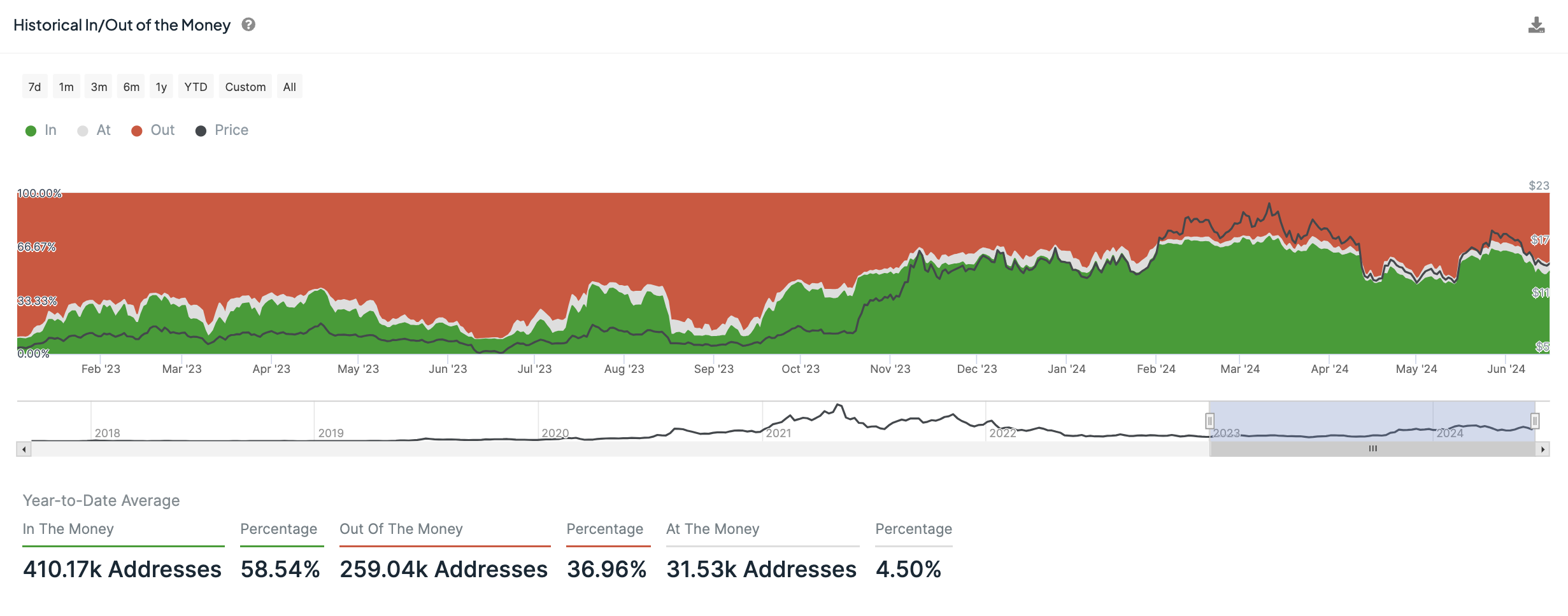 At the same time, the proportion of addresses at the break-even point remained stable, starting at 5.07% and ending at 5.81%. This stability suggests few fluctuations in addresses that are neither profit nor loss, indicating a balanced market condition. The biggest daily increase in break-even addresses was on June 10, indicating a period when more addresses found themselves at the break-even point.