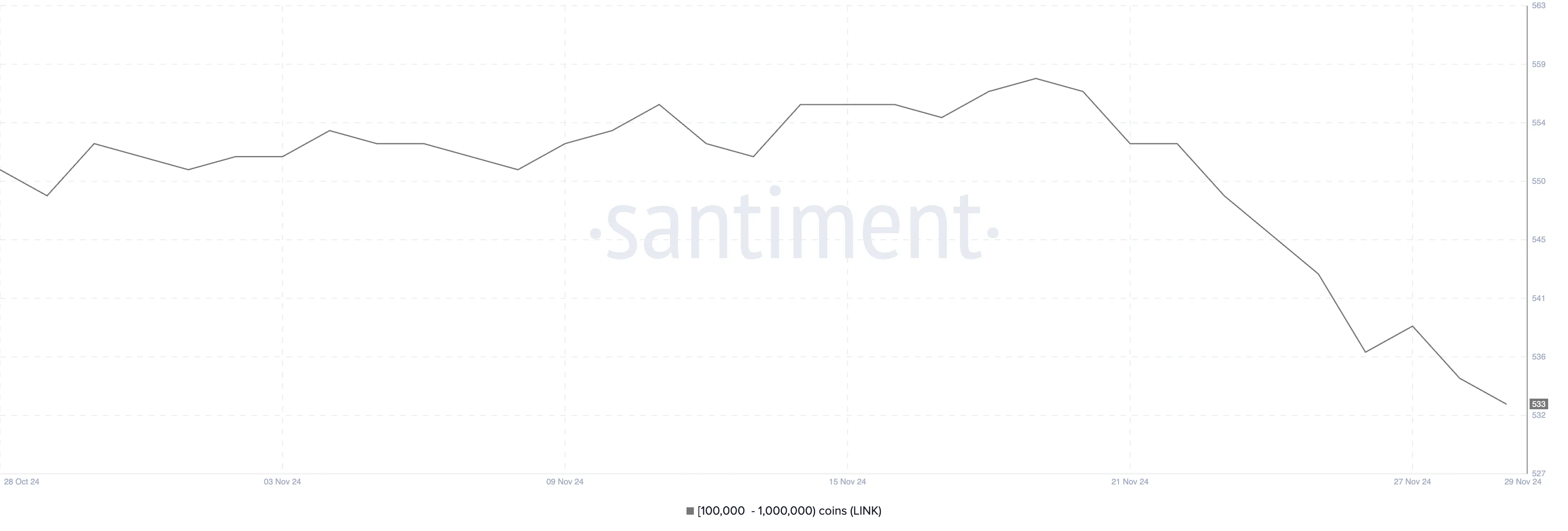 The number of wallets containing between 100,000 and 1,000,000 LINK dropped from a yearly high of 558 on November 19 to 533 currently, suggesting large investors may be taking profits or redistributing their holdings.