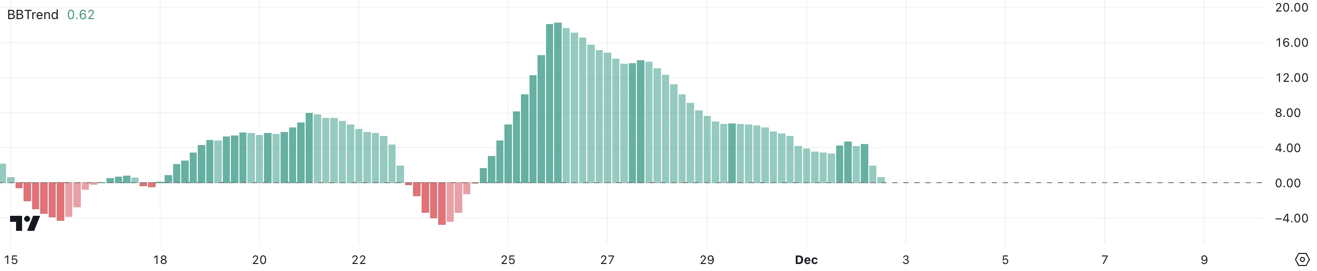 Chainlink BBTrend (Bollinger Bands Trend) indicator has weakened significantly, dropping from its peak of 18.2 on November 26 to just 0.44 currently while maintaining positive territory since November 25.