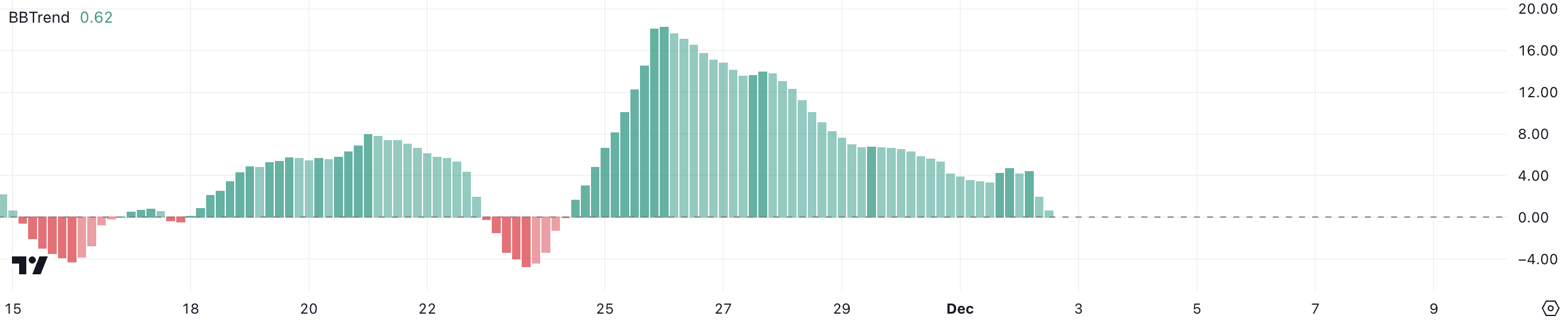 Chainlink BBTrend (Bollinger Bands Trend) indicator has weakened significantly, dropping from its peak of 18.2 on November 26 to just 0.44 currently while maintaining positive territory since November 25.