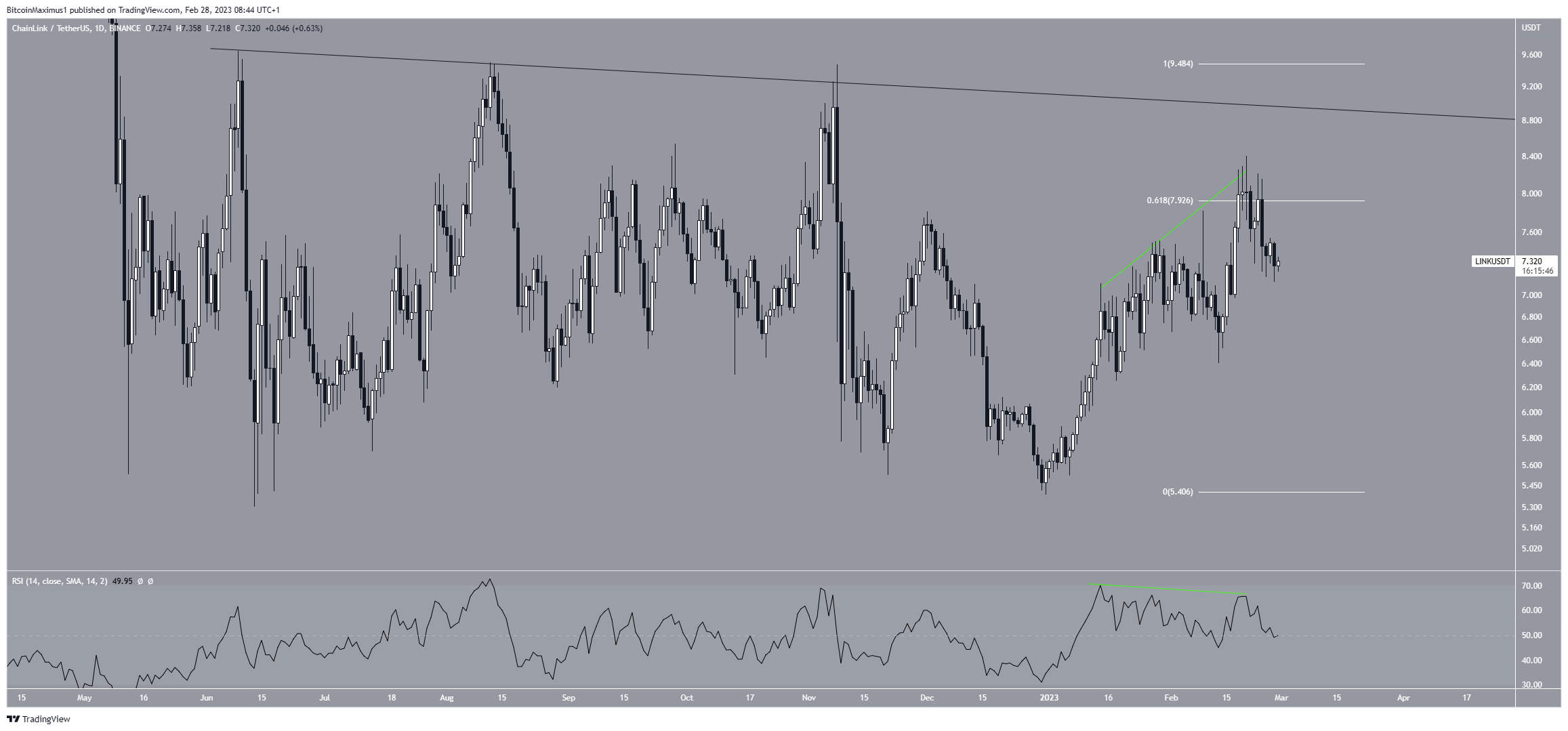 Despite the bullish outlook from the weekly time frame, the technical analysis from the daily one shows weakness. This is visible in both the bearish divergence in the daily RSI and rejection from the $7.93 resistance, created by the 0.618 Fib retracement resistance level (white). While the LINK price initially increased above the area, it created a long upper wick and fell afterward.