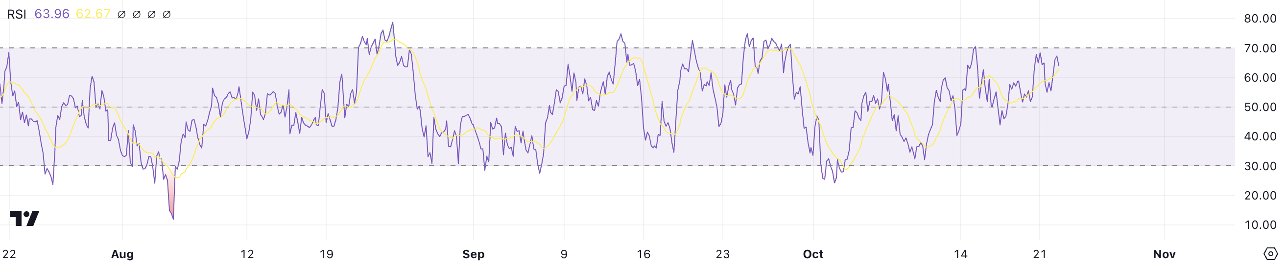 The RSI is a key indicator used to measure the speed and change of price movements. Values above 70 typically indicate overbought conditions, and values below 30 suggest oversold conditions.