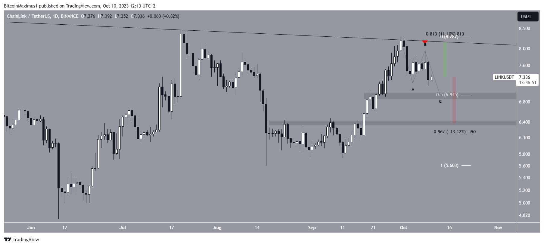The weekly timeframe technical analysis shows that the LINK price has followed a descending resistance trendline since June 2022.