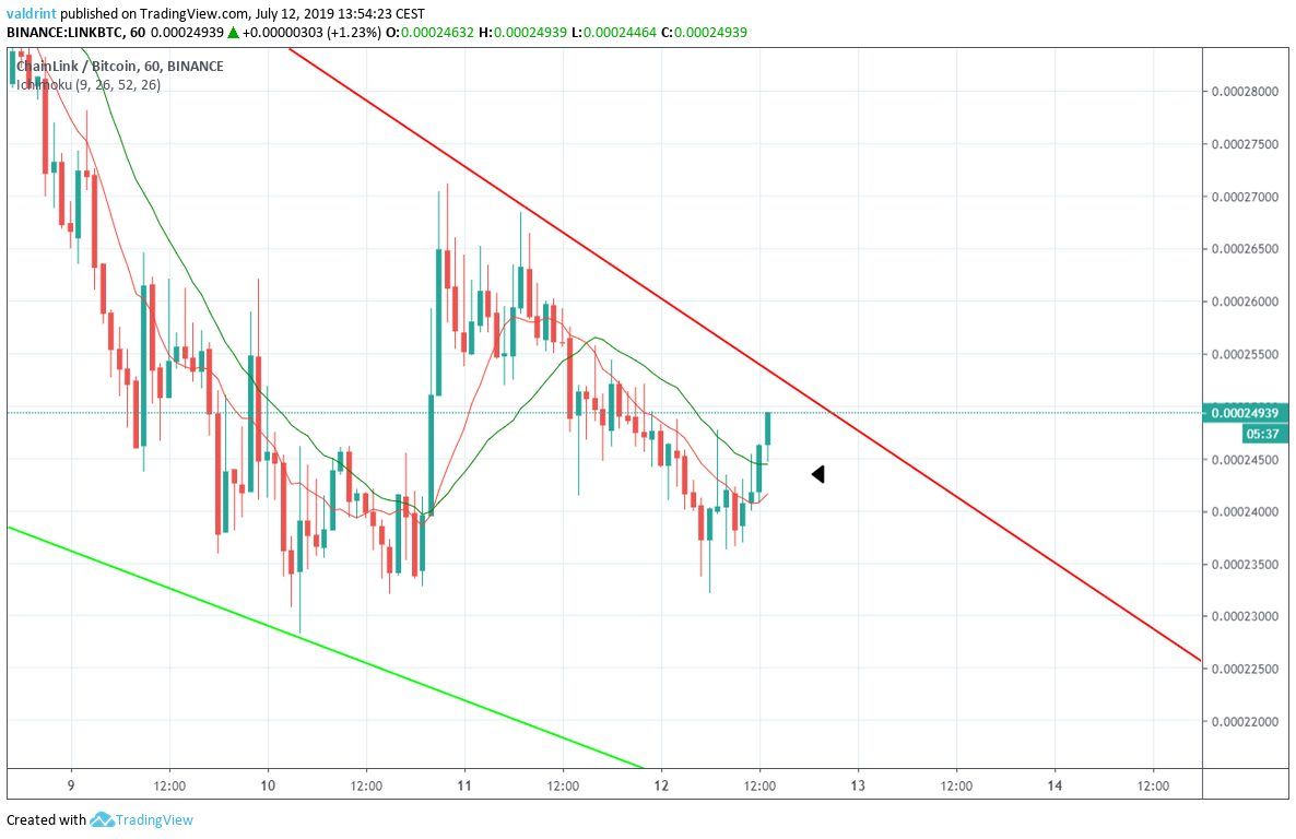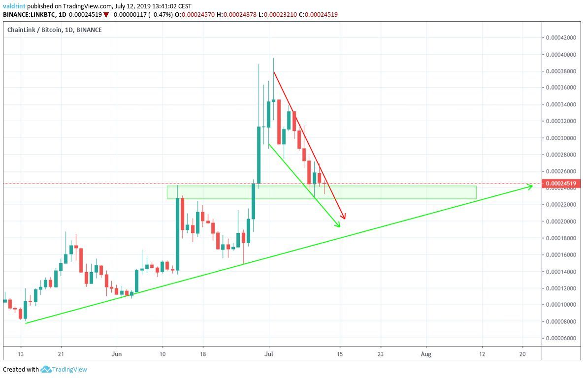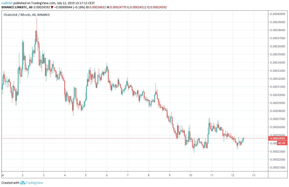 On July 1, 2019, the Chainlink price began an upward move. Highs of nearly 40,000 satoshis were reached the next day. However, the LINK price has been decreasing since. Prices below 23,000 satoshis were reached on July 10 — a decrease of almost 50 percent.