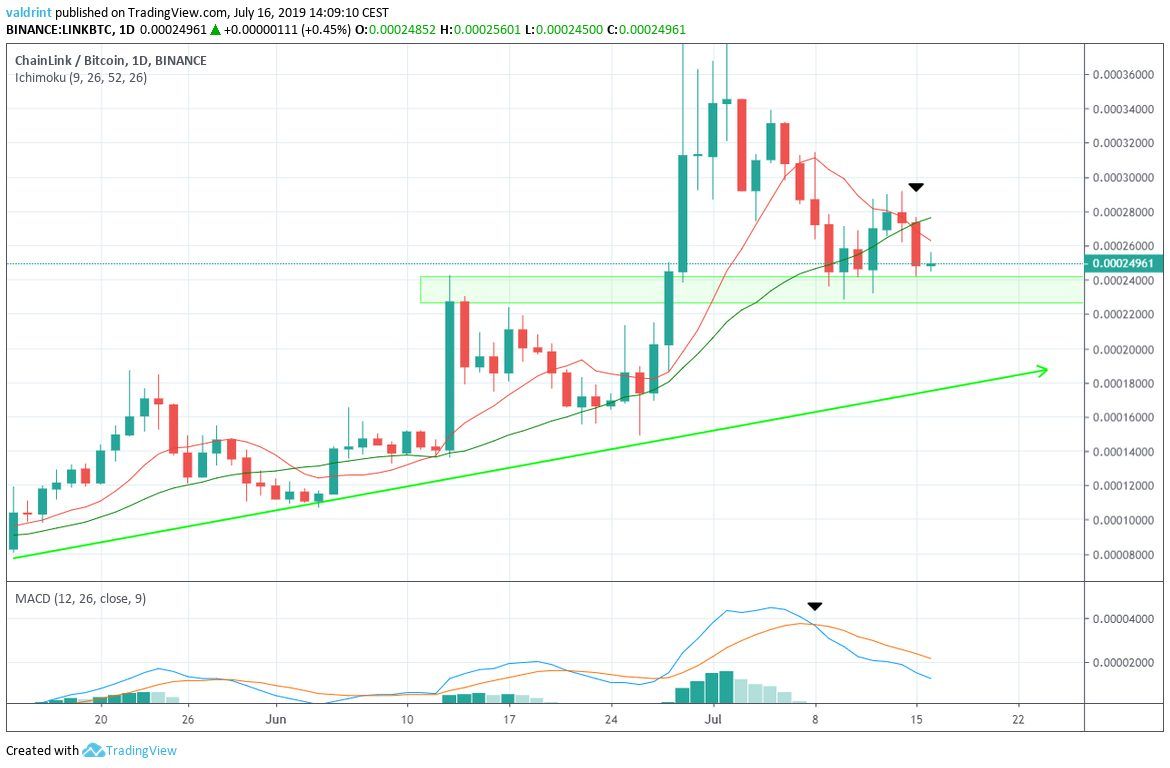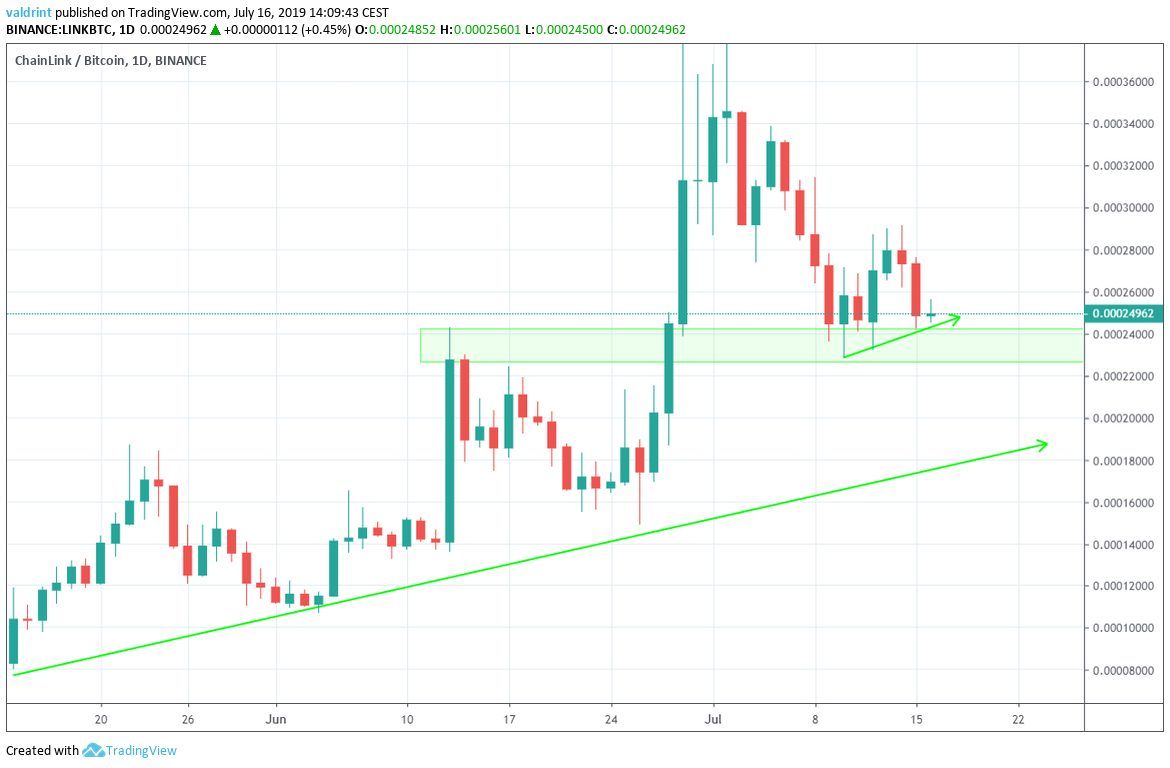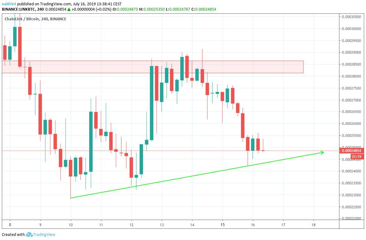 On July 10, 2019, the Chainlink price reached a low of 22,824 satoshis. After a weak upward move, it reached similar levels again on July 12. Since then, it has been increasing.