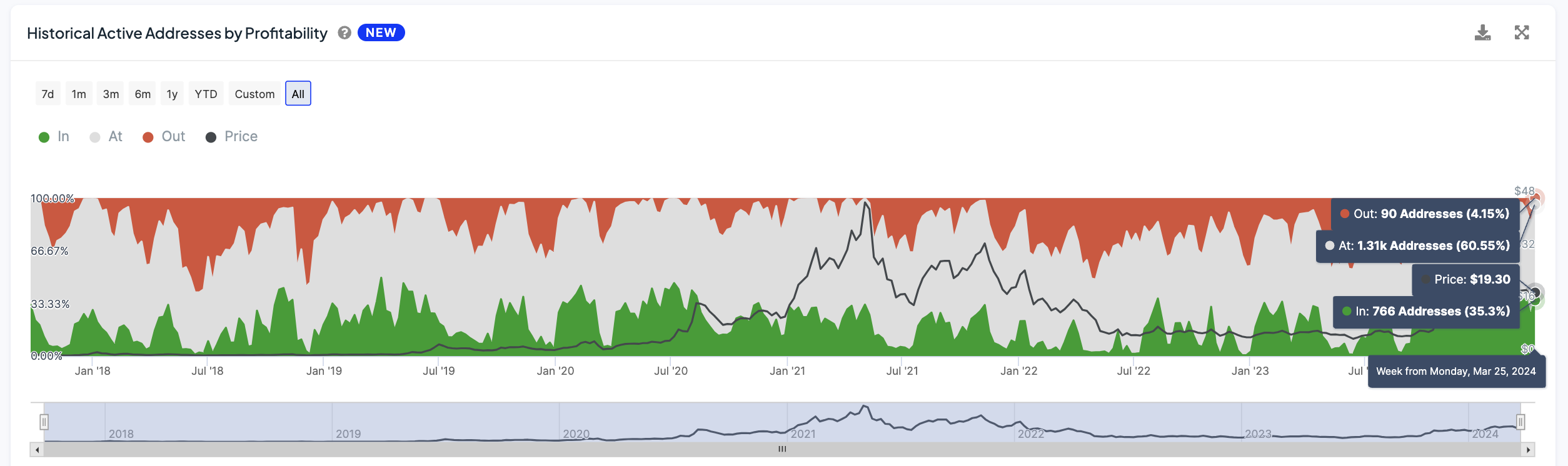 Currently, 35% of active LINK addresses are in a profitable position, with an additional 60% sitting at the break-even point. This effectively means that approximately 95% of LINK holders are not facing any losses from their current holdings, creating a robust foundation for market confidence.