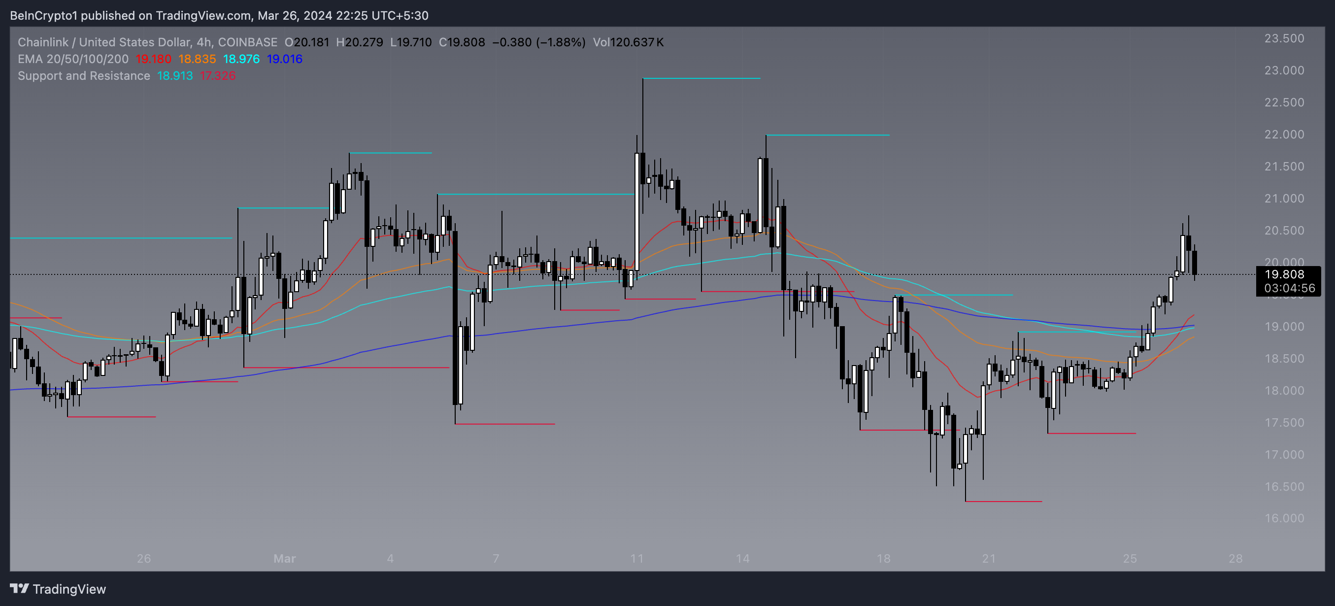 The 4-hour price chart for Chainlink (LINK) has just displayed a significant technical indicator, as its Exponential Moving Average (EMA) lines have formed a golden cross.