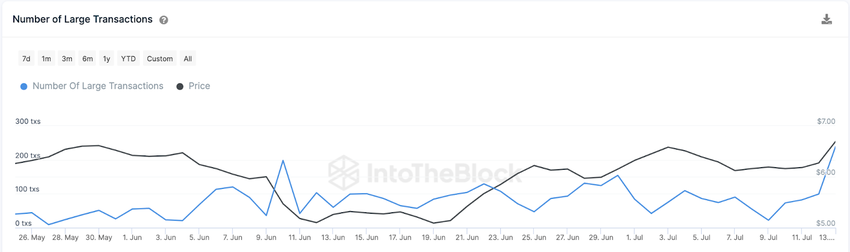 On-chain data shows that whale investors began to place big bets on LINK around June 2023. According to IntoTheBlock, Chainlink only attracted 26 Whale Transactions on May 31.