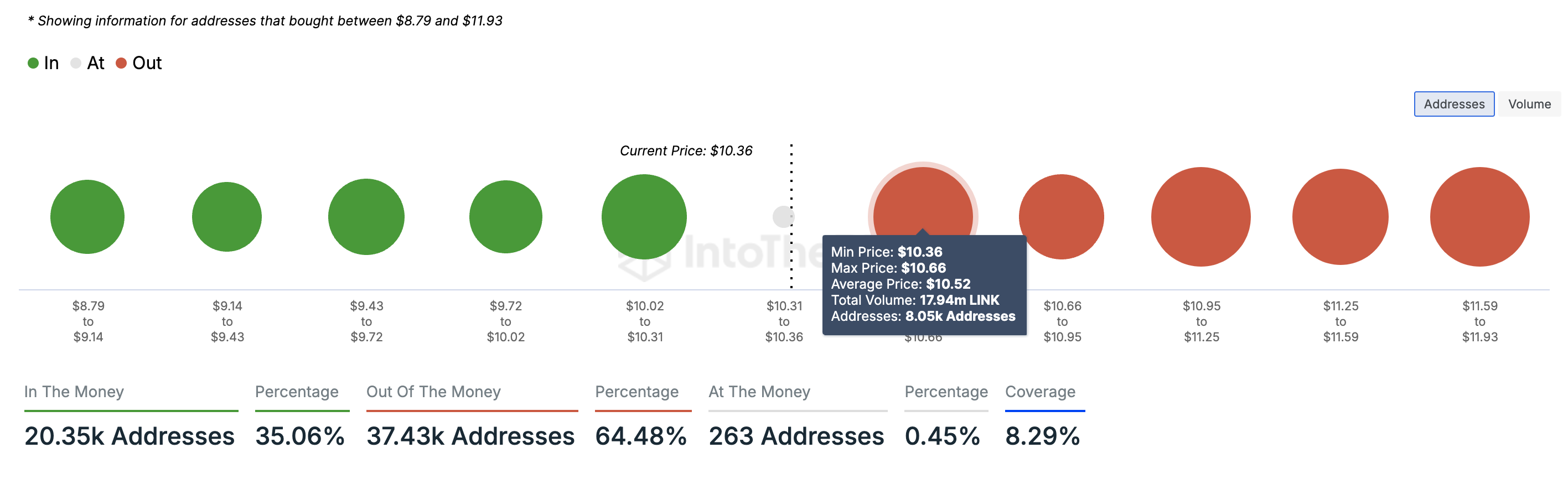 SponsoredThe higher the number of addresses within a specific price range, the stronger the support or resistance at that level. According to IntoTheBlock, around 5,540 addresses bought 4.46 million LINK at roughly $10.16, putting them in the money. In contrast, over 8,000 addresses purchased 17.94 million LINK at about $10.52, placing them out of the money.