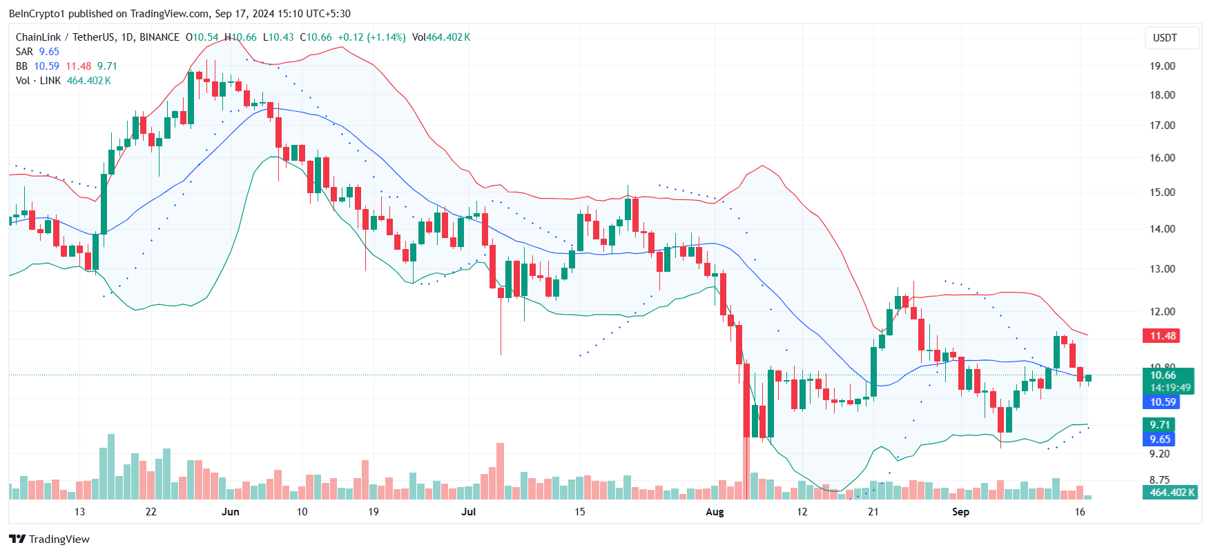 For LINK, this could translate into a price rally if the base line of the indicator remains below the candlesticks, signaling bullish momentum. If Chainlink can maintain its current position within the Bollinger Bands and avoid a downward break, the potential for an upward surge increases.