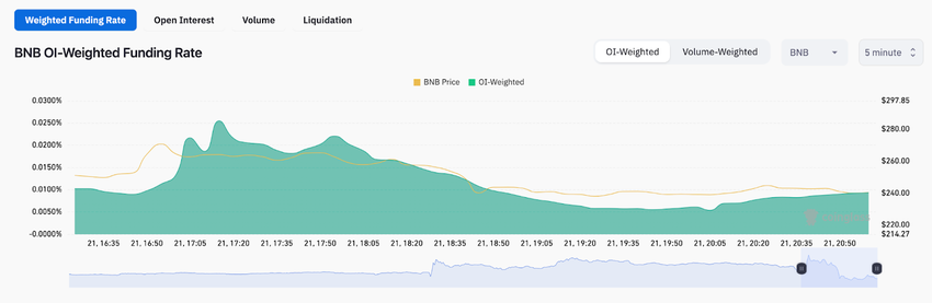 The chart below illustrates that BNB Funding Rate dropped from a daily peak of 0.025% to 0.0093% at press time.