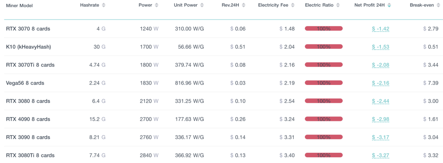 Before venturing into KAS mining, the first step is selecting the right mining rig. While KAS mining could be done with GPUs earlier this year, it might not be a good idea to mine KAS with traditional graphics cards at the current stage. ViaBTC’s Mining Profit Rankings show that using 3070 GPUs and similar traditional graphics cards for KAS mining could result in substantial losses.