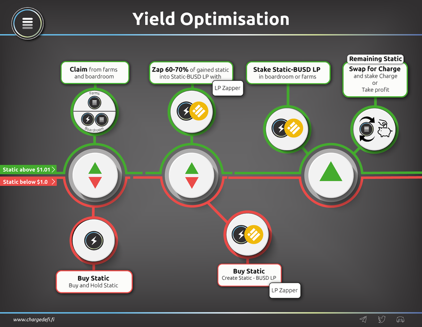 Users can invest in the liquidity pools that help to maintain the rebasing mechanism for $STATIC. Investors receive a reward, through an entity called the Boardroom every epoch (~8 hours). Charge DeFi also maintains a decentralized exchange (DEX) called Smart Swap. It acts as a medium of exchange between $STATIC and $CHARGE.
