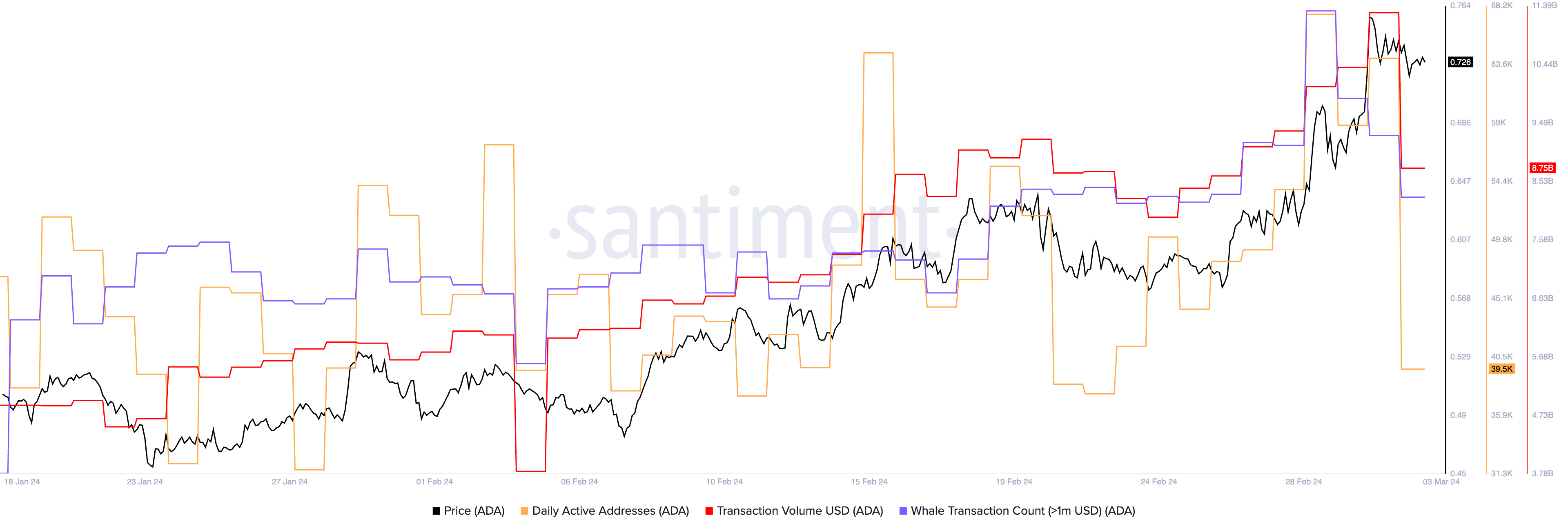 “The uptrend in Cardano appears healthy! There’s a notable rise in daily active ADA addresses, transaction volume, and transactions from ADA whales. This increasing activity signifies strong network engagement and investor interest, positive indicators for continued growth,” Martinez said.