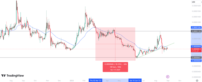 After a significant sell-off in early 2023, the price climbed in anticipation of the Shibarium release. However, the botched launch led to a drastic sell-off, causing SHIB to cross below the 50-day EMA for the first time since March, and it has been unable to reclaim the level since.