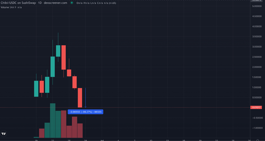 Due to the rug pull, the native token of Chibi Finance, CHIBI, plummeted by over 99% on Tuesday.