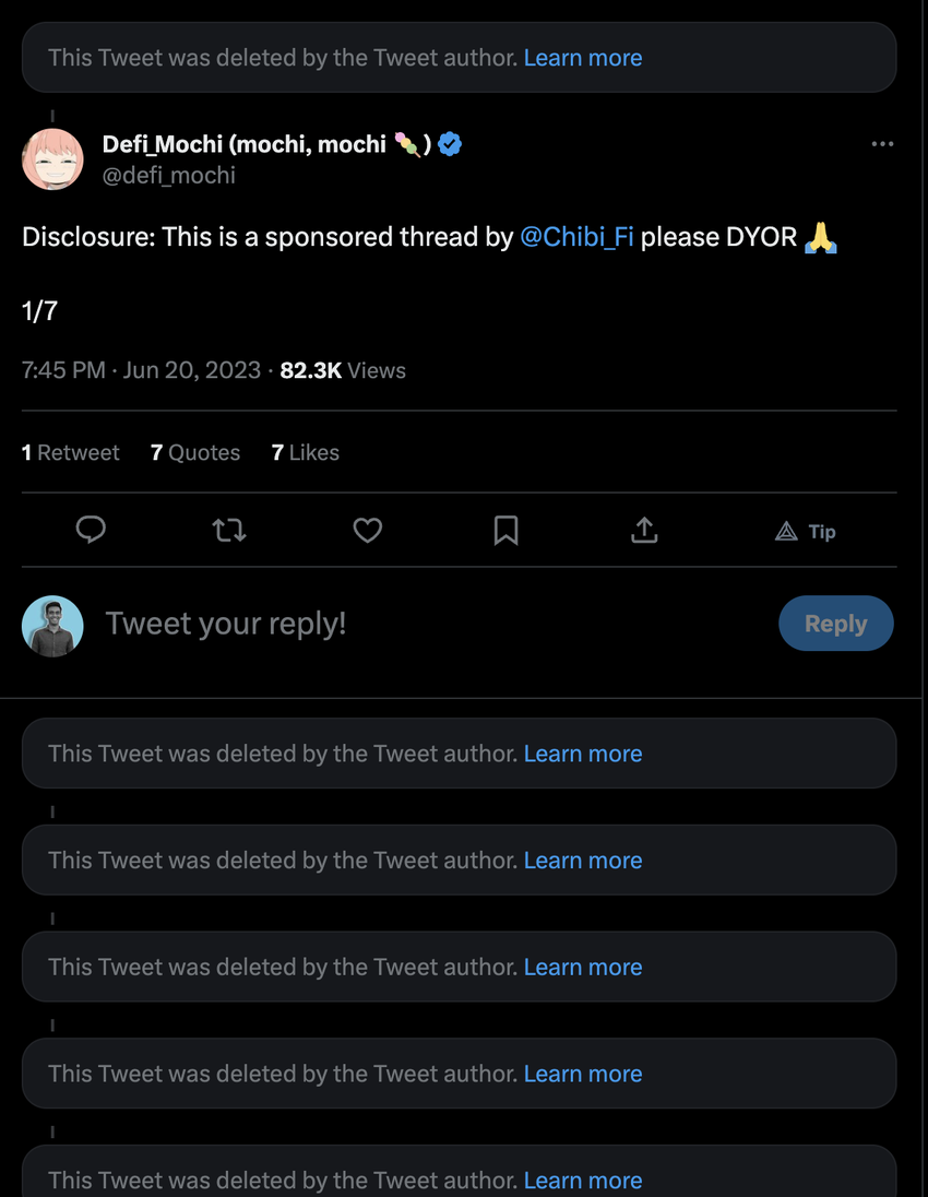 However, the Twitter influencer did mention that he was writing a sponsored thread on June 20. After the reports of the rug pull, the influencer deleted their thread.