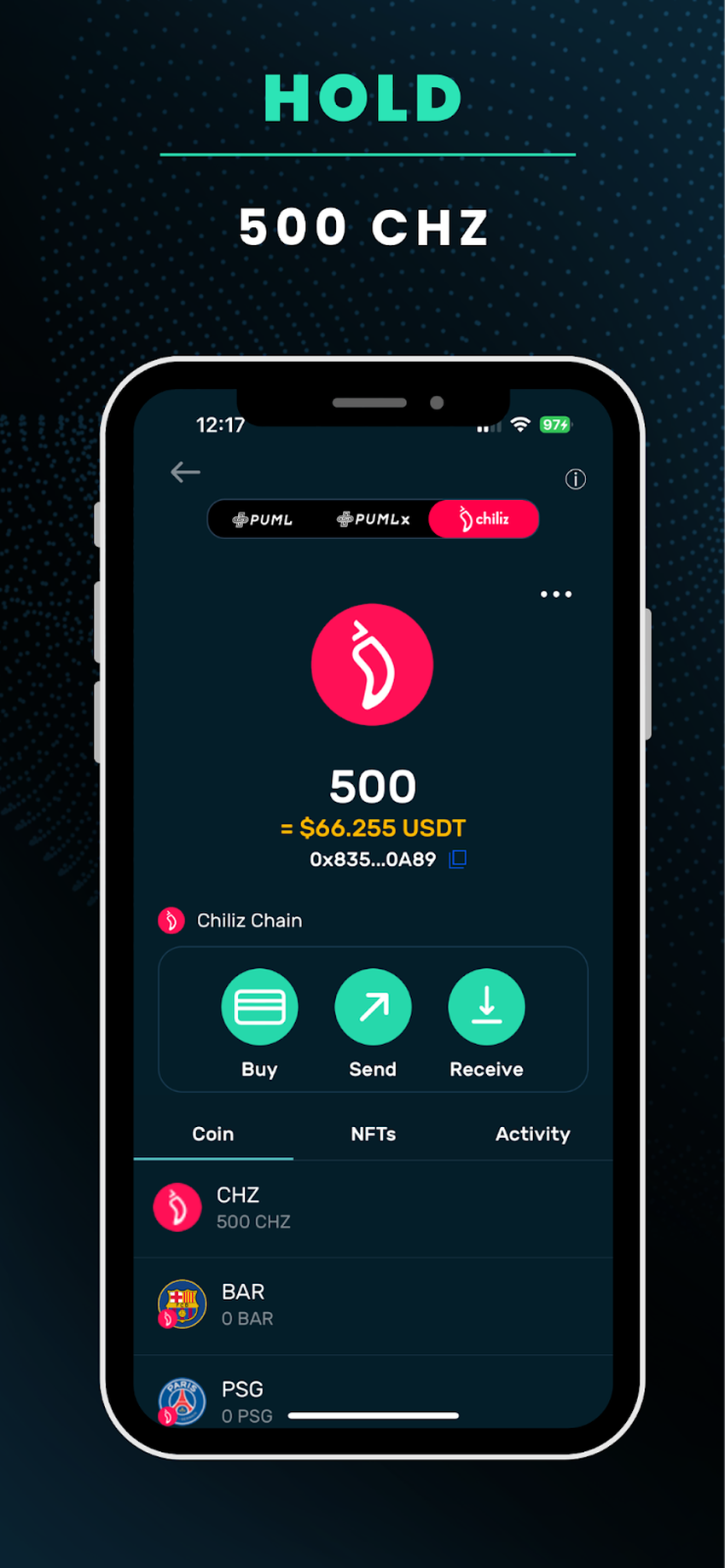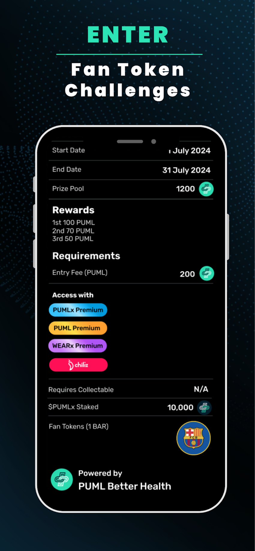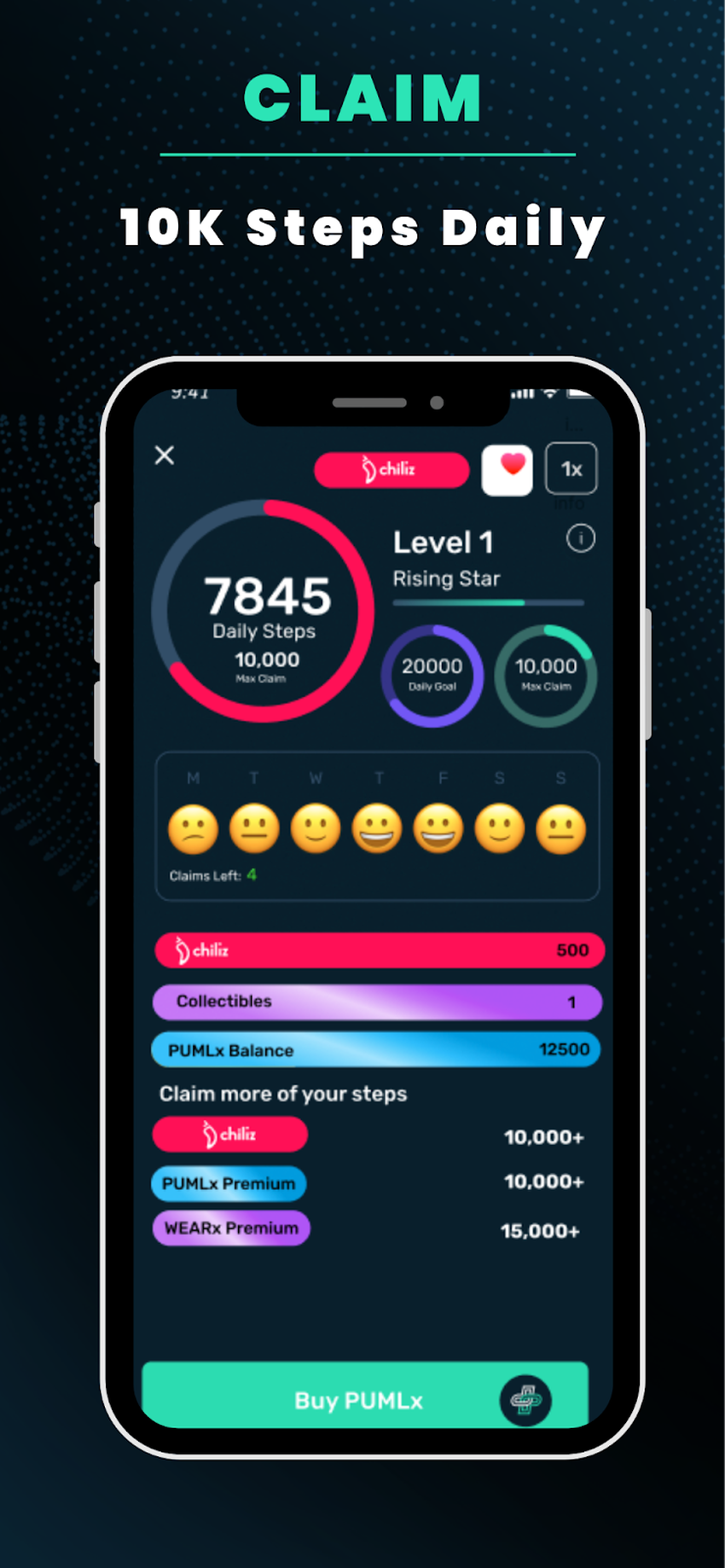 - Daily rewards: Chiliz users will now be able to boost their daily claim rewards by holding 100 CHZ in the PUML self custody wallet, directly in the app. This allows CHZ holders the ability to claim 10K steps per day plus receiving the benefits of a paid premium subscriber provided they maintain their balance above 100 CHZ.